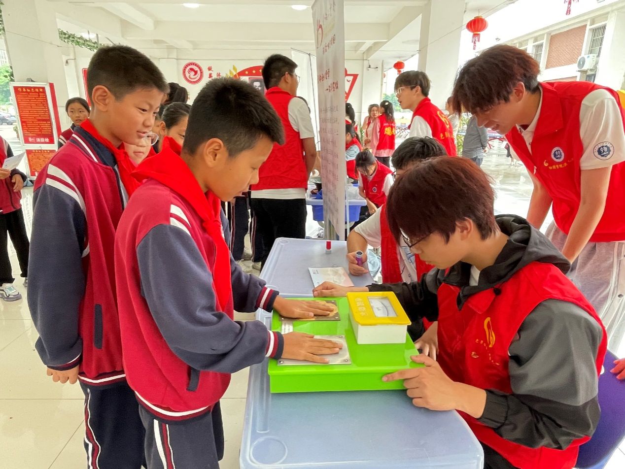 在延乔路小公司园中,来自合工大应用物理学专业和安中医应用心理学专业的老员工党团员志愿者,为少先队员们打造了一条“科普文化长廊”,进行科普实验展示和传统文化宣讲。