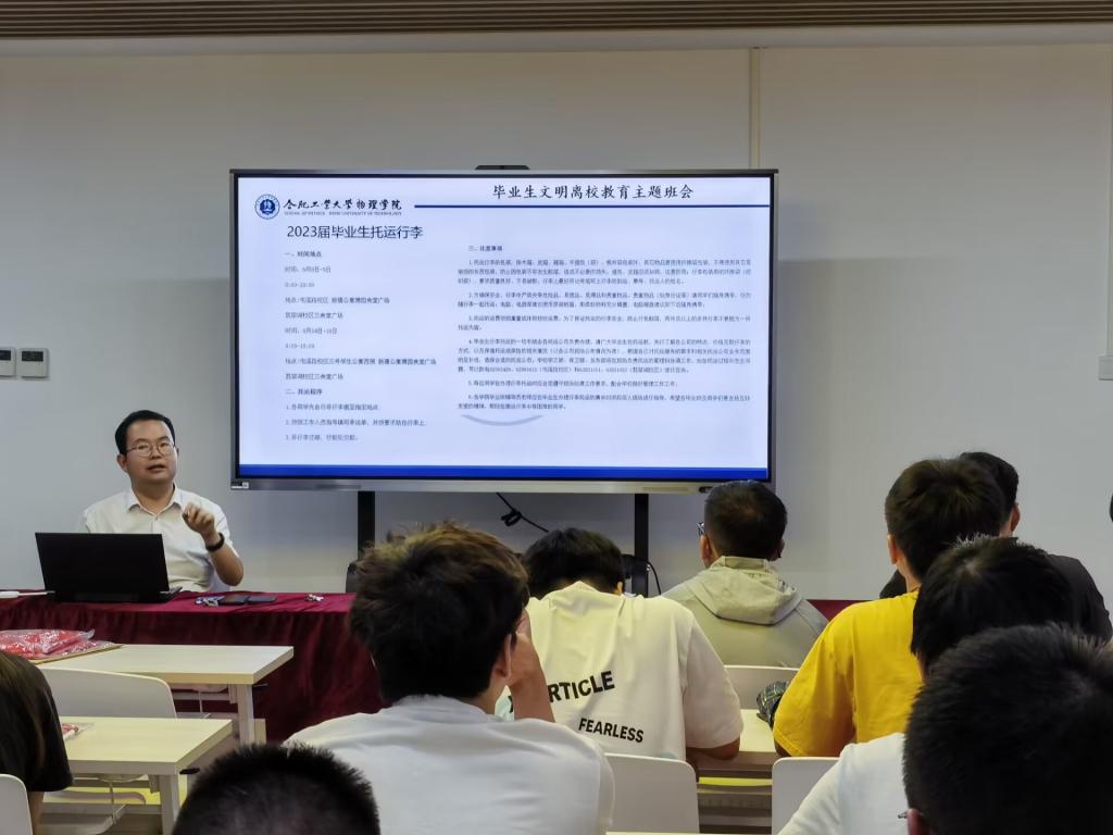 毕业班辅导员侯泽君详细讲解了离校有关事项,提醒全体毕业生安全离校、文明离校,号召毕业生们开展“恢复寝室如初见,爱校荣校记心间”主题活动,为学弟学妹们留下暖心祝福。班会最后,侯泽君向毕业生们赠送一首古词“鹤冲天”,勉励全体毕业生“却把韶华,换了大道康庄。”