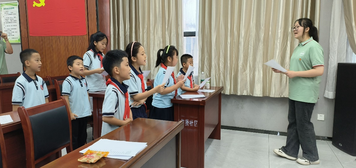 唱响一段红色旋律:“一起唱队歌,共行新使命”。在集贤社区,实践营选取《中国少年先锋队队歌》、《光荣啊,中国共青团》、《闪闪的红星》三首歌曲,由实践营成员为同学们讲述歌曲背后的故事,让全体少先队员们不仅“唱”,更要“懂”,真正将“党团队”一体化建设深入到社会实践活动中去。随后,实践营成员将歌曲逐字逐句教授给全体少先队员,全体成员共同在嘹亮的歌声中体会历史的厚重,在跳动的音符中回望岁月的峥嵘,以歌曲背后蕴含的伟大精神及党和人民对全体少先队员的殷切期待帮助青少年树立正确的人生观、价值观,激发其爱国主义情怀。