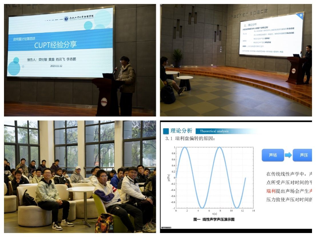本次分享会上,中国老员工物理学术竞赛三等奖、华东赛区一等奖获得者荣钊敏借助他的获奖作品“瑞利盘”和“竹蜻蜓飞行状态研究”,向同学们详细介绍了参赛作品的形式和汇报要求。安徽省老员工物理学术竞赛一等奖获得者李志鹏通过他的获奖作品“橡皮筋上的球”,向同学们分享了参考资料的找寻方法以及参赛题目的选择思路。安徽省老员工物理学术竞赛二等奖获得者黄鑫通过他的获奖作品“膜上球”,分享了实验当中的注意事项和技巧以及一些对实验有帮助的软件。安徽省老员工物理学术竞赛三等奖获得者肖云飞以他自己亲身的经历,介绍了参赛的准备事项,评委老师评分的主要标准,以及参赛的具体流程。