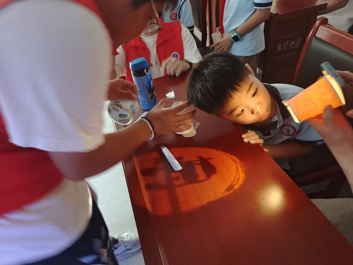 志愿团队施以文化浸润同时不忘引发孩子们探寻科学,紧接着中秋宣讲后便开展了光学科普手工制作——纸杯投影仪。材料处处可见、制作步骤简单而成果又不失趣味,看着一个个由自己亲手绘制的图案在光线下以影子呈现出来,孩子们一个个笑得合不拢嘴,享受着最纯真的快乐的同时也锻炼了动手能力,提高了科学素养。
