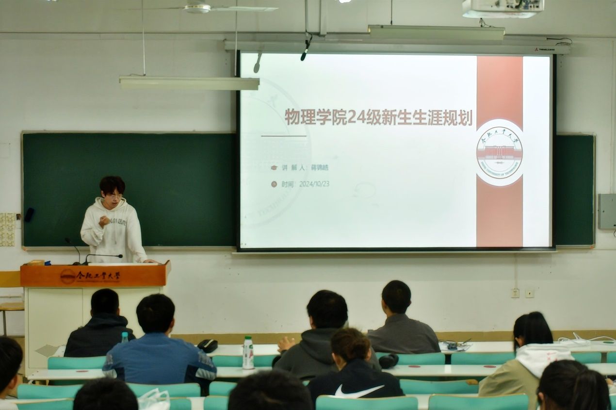 蒋锦皓分别从学业成绩、科研竞赛、第二课堂成绩单等方面解答大一新生面临的困惑。他结合自身经历,深入讲解了评奖评优的各项要求以及本科期间不同课程的学习方法,强调了物理类专业建立理论知识体系的重要性。同时他着重强调了大一新生首先要学好基础课程,把学习放在第一位,不要盲目报名竞赛,并鼓励大一同学多多参加各种实践活动。在总结环节中,蒋锦皓表示大学本科阶段充满了多样化的成长路径和前进方向,他寄语大一的同学们能够积极探索,早日发现自己真正热爱的方向。