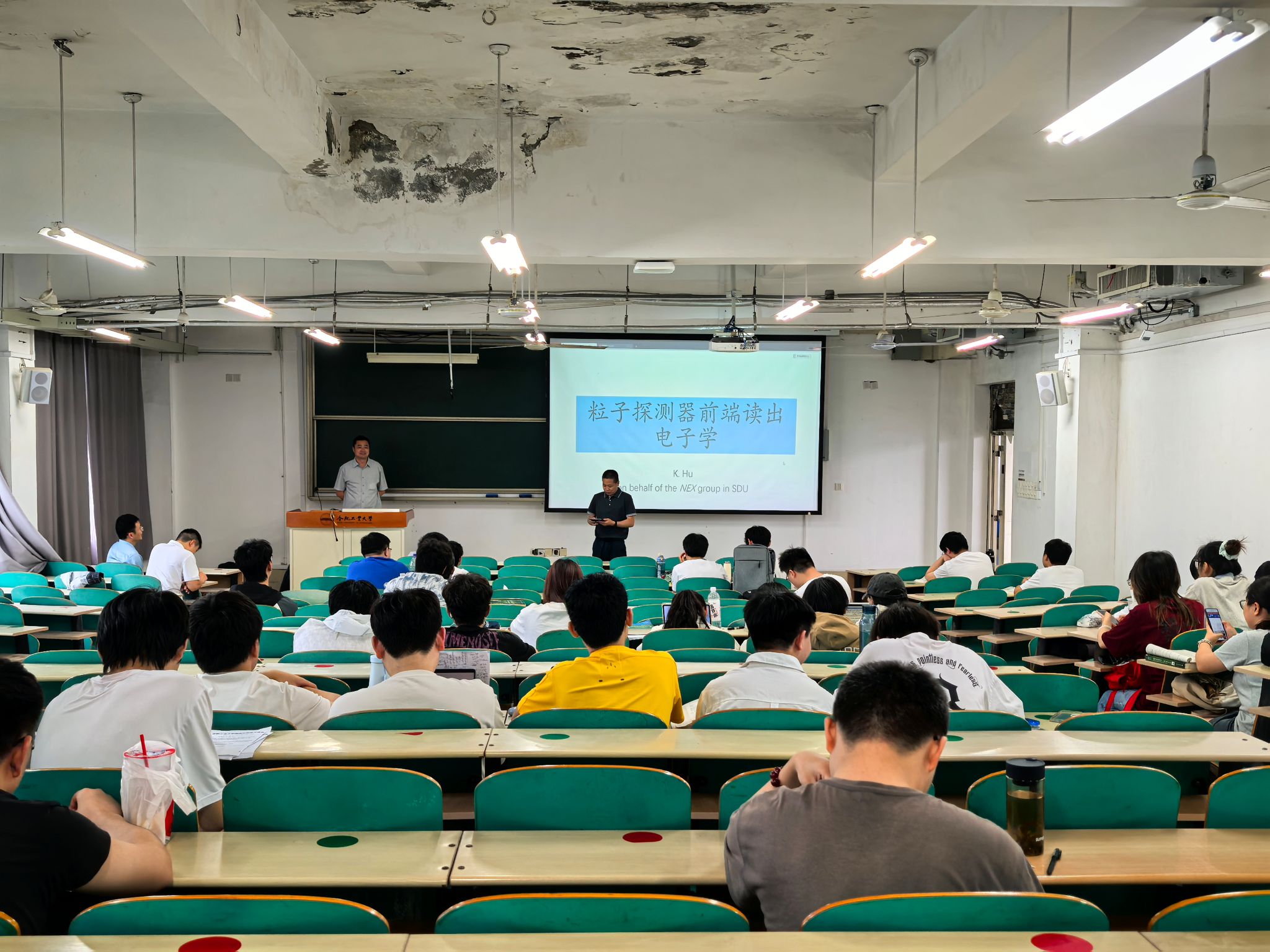 报告中,胡坤教授以 “大科学装置中的粒子探测技术” 为核心,详细阐述 ATLAS 对撞机、PandaX 暗物质探测等国际前沿实验中前端电子学的关键作用。针对不同实验环境的特殊需求,胡坤教授结合具体案例分析技术难点与解决方案:在大型高能粒子对撞机 ATLAS 实验中,面对超高计数率与强信号环境,前端电子学系统需具备高耐辐照特性;而在 PandaX 暗物质探测这类极弱信号实验中,则要求电子学系统实现极低本底。同时,胡坤教授结合自身参与项目的研究经历,系统介绍不同实验条件下核电子学系统的设计思路与实现路径,并延伸讲解所研发前端电子学系统在核医学仪器正电子发射断层显影 PET 中的应用。报告内容既保持学术深度,又注重科普性,帮助本科生系统了解粒子探测电子学领域的研究现状与应用前景。