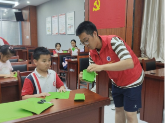 随后,志愿者们带领少先队员们进行折纸军帽的手工制作。大家认真折叠,互相帮助,一顶顶整齐的军帽逐渐成型。孩子们在动手实践中感受到抗战将士们的英勇与奉献精神,也进一步增强了对祖国的热爱与敬意。