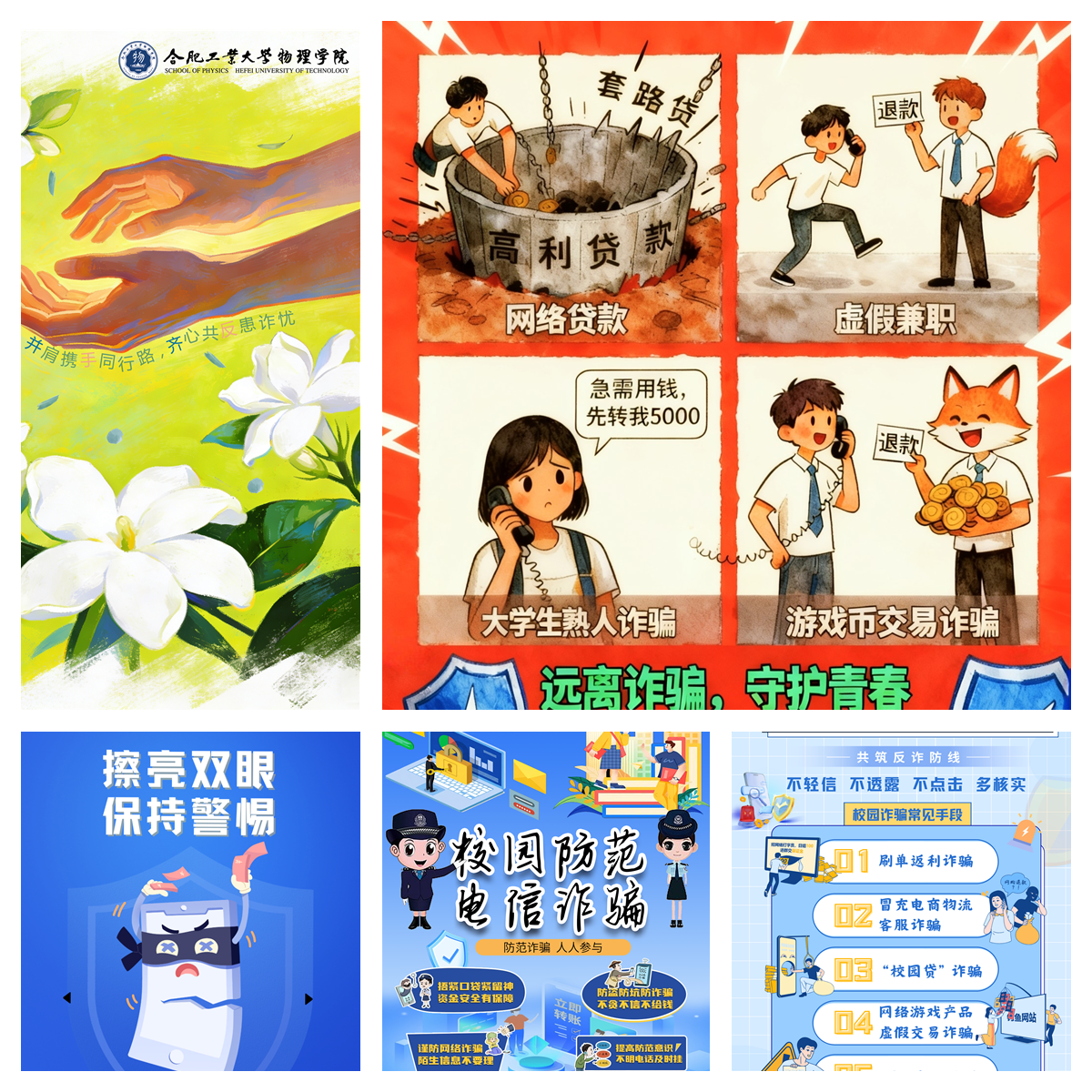 大赛自启动以来,得到全院员工的积极响应与广泛参与。同学们紧扣“反诈”核心主题,聚焦刷单返利、网络交友、虚假兼职、校园贷等校园高发诈骗类型,充分发挥创意才华,将反诈知识与视觉艺术相结合,精心设计提交了一批主题鲜明、构思新颖、警示性强的海报作品。作品通过简洁有力的图文搭配、生动形象的场景再现,直观揭示诈骗套路,清晰传递防诈要点,既展现了物理学子的艺术素养,更彰显了青年一代参与安全建设的责任担当。