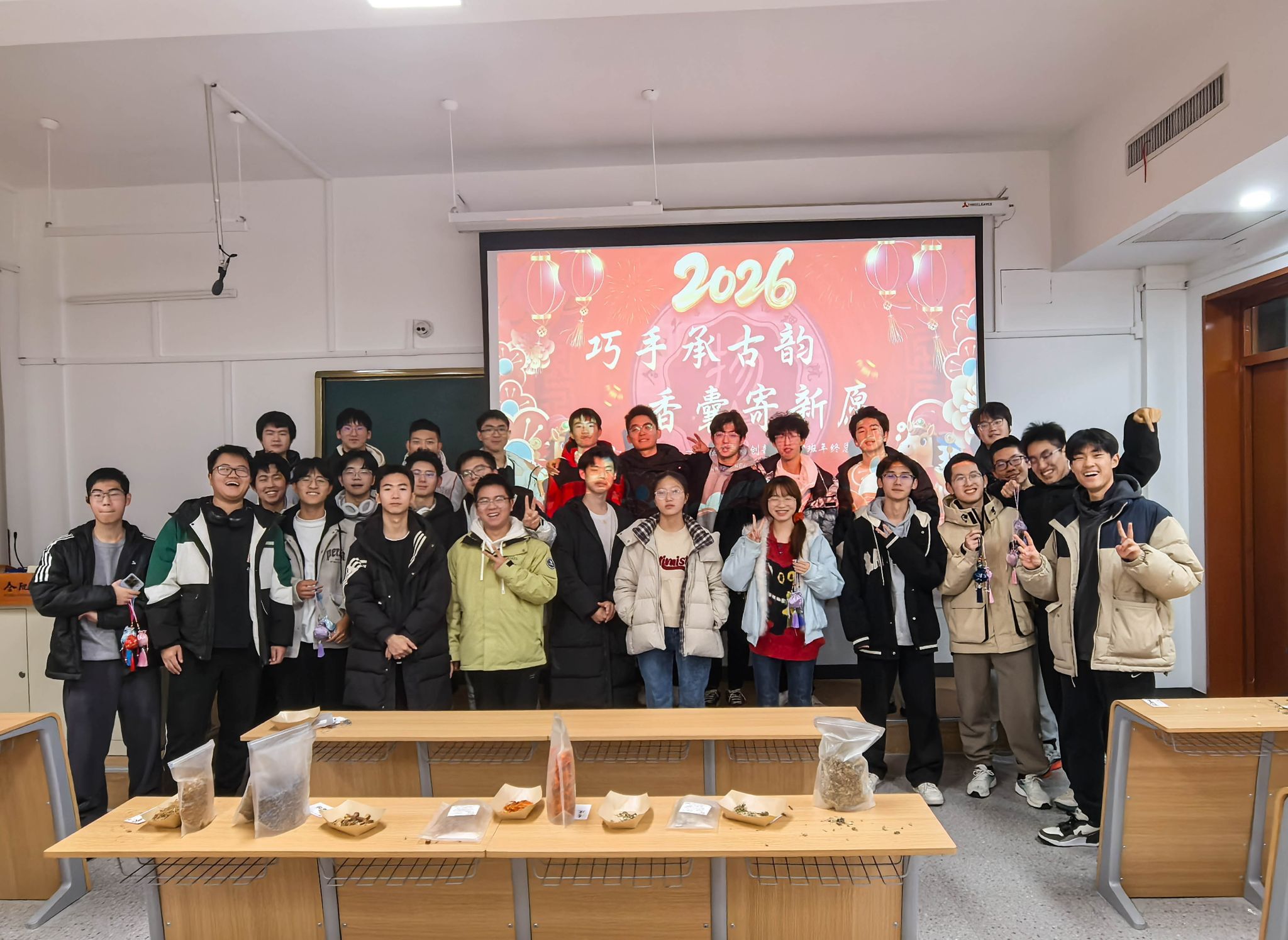 随后,大家手持自制的香囊合影留念,部分同学分享了参与活动的感悟,表达了对传统文化的新认识与对班级活动的喜爱。随后,班长吴睿航主持开展了学期总结与新年展望环节,同学们踊跃发言,回顾入学以来的成长与收获,畅谈对未来的期待与规划。