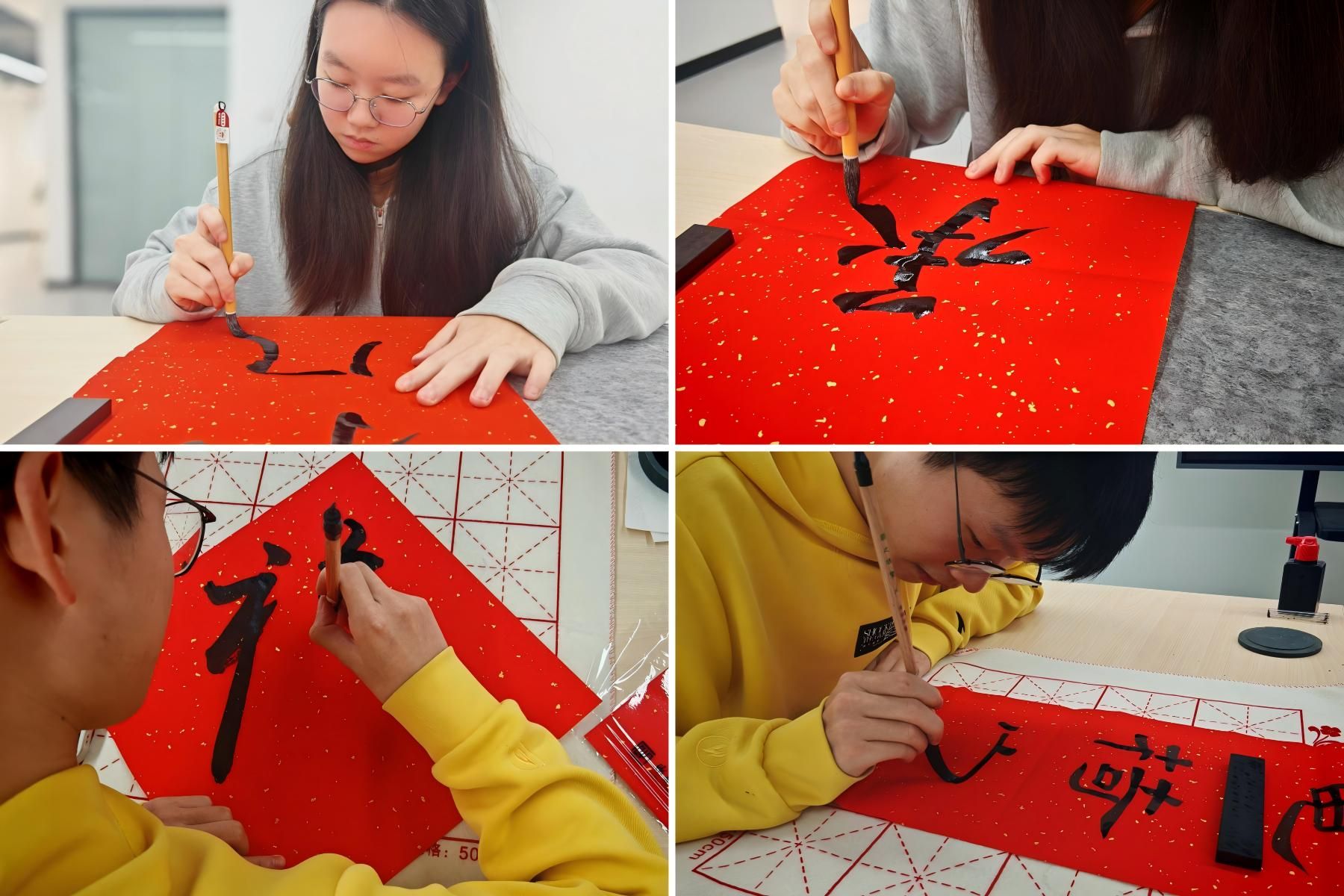 活动现场红纸铺展,墨香四溢,洋溢着浓厚的节日气息。公司精心准备了毛笔、墨汁、宣纸、拓印工具等齐全的物料。同学们热情高涨,有的选择经典隽永的传统对联词句,有的则发挥创意自拟心意祝福。笔锋或遒劲有力,或娟秀工整,或灵动活泼,一幅幅承载着美好寓意的春联和一个个形态各异的“福”字陆续诞生,将现场装点成一片红色的海洋。