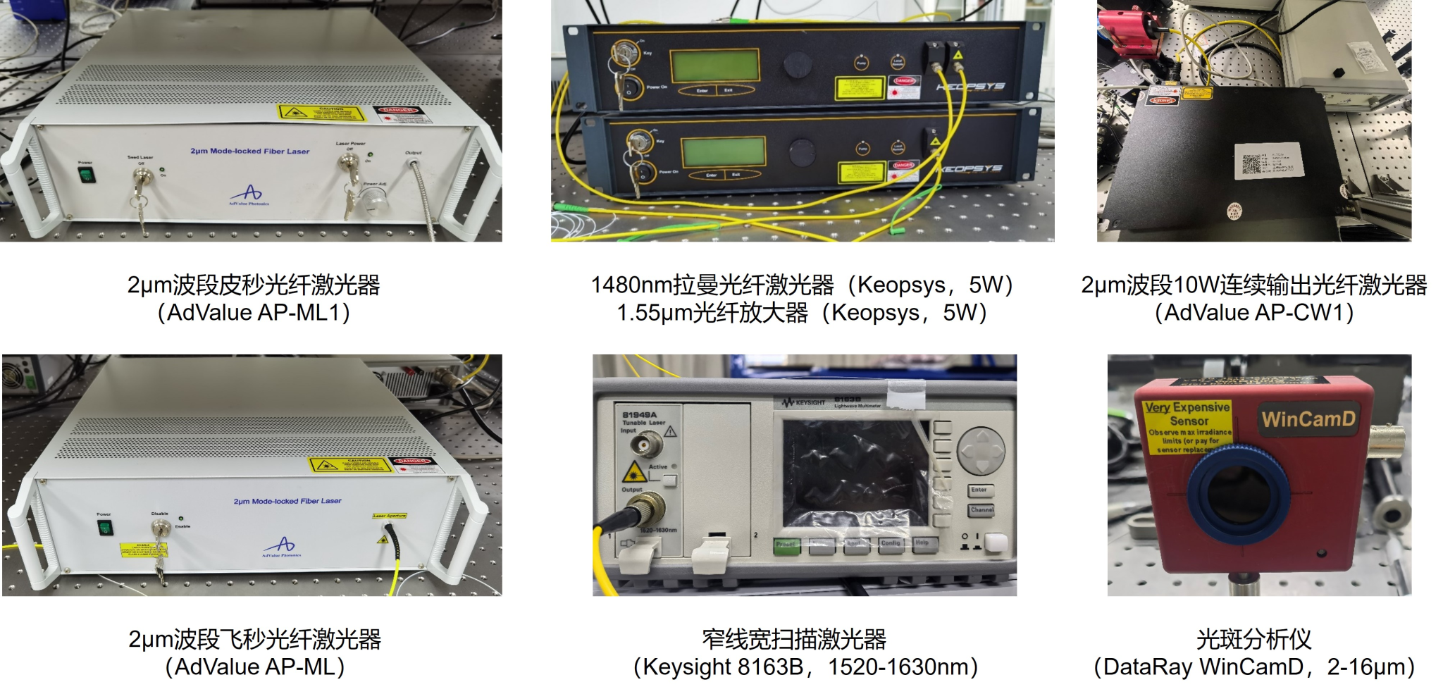3)光源设备:AdValue AP-CW1 2μm波段10W连续输出光纤激光器、AdValue AP-ML1 2μm波段皮秒光纤激光器、AdValue AP-ML 2μm波段飞秒光纤激光器、Keysight 8163B窄线宽扫描激光器(1520-1630nm)、Keopsys 1480nm拉曼光纤激光器(5W)、Keopsys 1550nm光纤放大器(5W)、1570nm单波长激光器(3W)、超连续谱光源、高功率980nm半导体泵浦激光器。