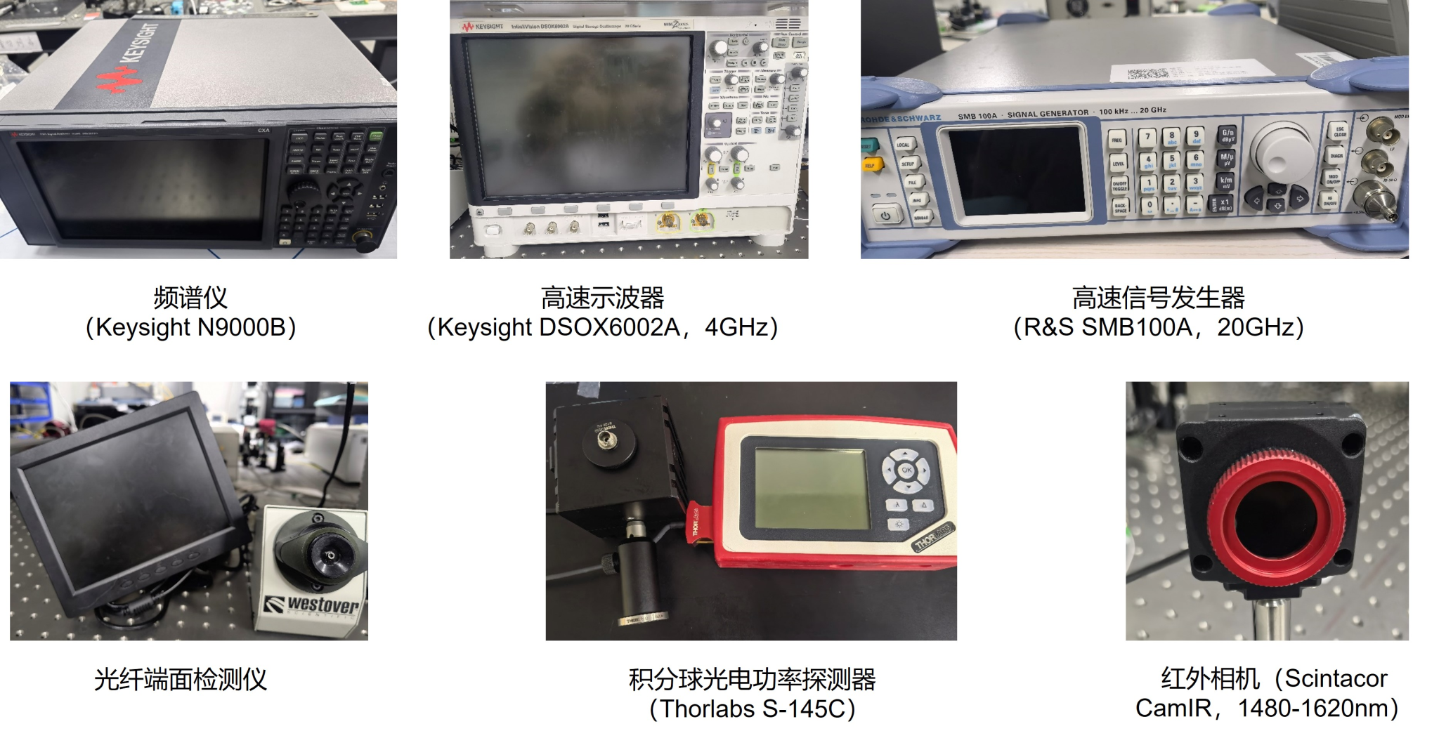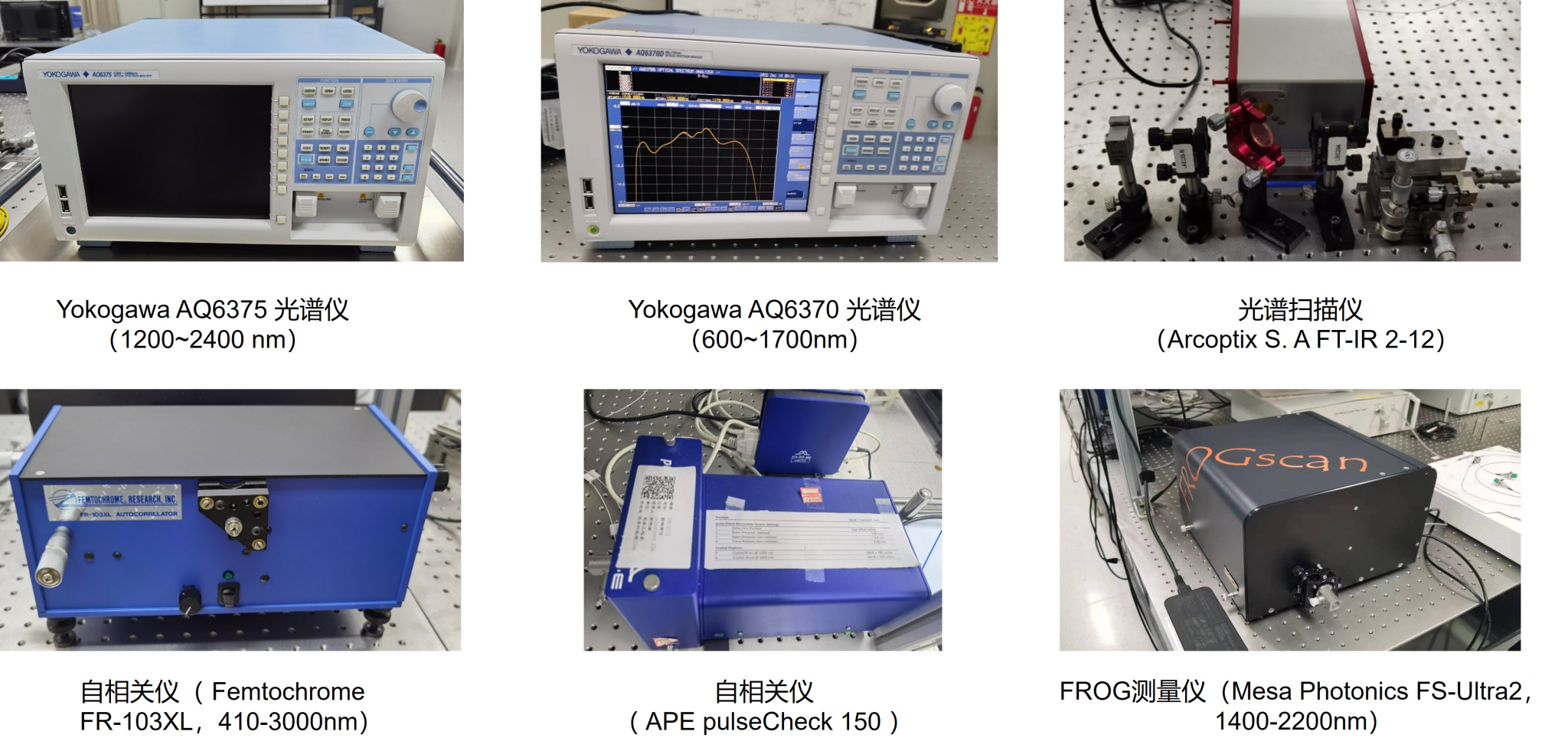 2)测量设备:Yokogawa AQ6375光纤光谱仪(1200-2400nm)、Yokogawa AQ6370D光纤光谱仪(600-1700nm)、Arcoptix S. A FT-IR 2-12光谱扫描仪(2-12μm)、Femtochrome FR-103XL自相关仪(410-3000nm)、APE pulseCheck 150自相关仪(1500-2200nm)、Keysight N9000B频谱仪(26GHz带宽)、Keysight DSOX6002A高速示波器(4GHz带宽)、MSO8204高存储深度示波器(2GHz带宽、10GSa/s采样率、500M存储深度)、R&S SMB100A高速信号发生器(20GHz)、Newport光功率计(0.6-10.6μm)、EOT ET-5000F高速探测器(12.5GHz)、Thorlabs SA200-12B扫描干涉仪(1.5GHz;1275-2000nm)、Thorlabs SA200-12B扫描干涉仪(10GHz;1275-2000nm)、DataRay WinCamD光斑分析仪(2-16μm)、Scintacor CamIR红外相机(1480-1620nm)。