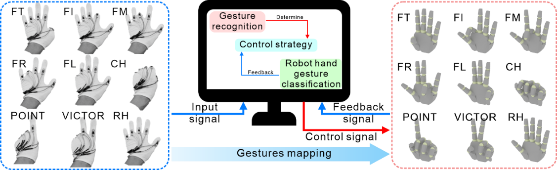 该工作制备可生物降解的明胶纳米复合材料,通过丝网印刷工艺加工具有双应变层裂纹结构的柔性应变传感器,所制得传感器具有良好拉伸应变(可达20%)、高应变系数(1296)、低迟滞(±2.5%)、快速响应(60 ms)和良好可重复性(6000次循环)。将传感器用于检测人体手部姿态并实现手势分类识别,结合气动驱动系统完成从人体手势到软体机械手的手势映射流程,图1为明胶基导电复合材料合成机理,图2为柔性可降解应变传感器结构设计示意,图3为基于柔性传感器的机械手手势映射流程。文章第一作者为必威西汉姆联刘彩霞,合作者为微电子公司柔性传感器课题组黄英教授、刘平副教授和研究生孙一帆等。该研究得到了中央高校基本科研业务费,浙江省“尖兵”“领雁”研发攻关计划以及浙江省重点研发项目的支持。