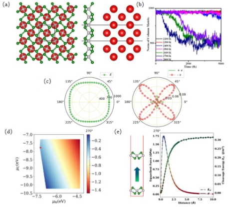 (a)二维penta-CN2结构及其衬底Nb(100)表面 (b)分子动力学模过程中sin 库伦矩阵模随温度的变化 (c)各向异性杨氏模量及泊松比依赖关系 (d) 碳、氮化学势调节CN2的Gibbs自由能 (e) 二维CN2剥离能及其剥离强度