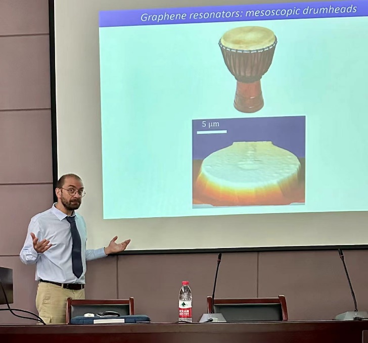Joel Moser教授首先讲述了低维谐振器的基本概念及其在现代电子信号处理中的关键作用,如构建滤波器、混频器和振荡器等。为了更直观地解释复杂的科学原理,教授巧妙地用传统乐器鼓来类比石墨烯纳米机械谐振器,从而引导听众更深入地理解这一科学领域。随着报告的深入,Joel Moser教授展示了他们在石墨烯非线性谐振器方面的最新研究成果。他详细描述了这些介观振动系统如何展现出不同的相态,并解释了其团队如何通过连贯的驱动力来选择和控制这些相态,以及如何利用栅极电压来实现对这些相态的精准操控。此外,教授还介绍了他们在石墨烯纳米机械视频接收器方面的新工作,特别是如何在石墨烯谐振器的振动中编码数字调制的视频信号,并将这种编码从振动高效地传输到光场。报告结束后,与会师生纷纷就报告内容与Joel Moser教授进行热烈的交流和讨论,现场气氛活跃,极大地激发了同学们的科研兴趣。