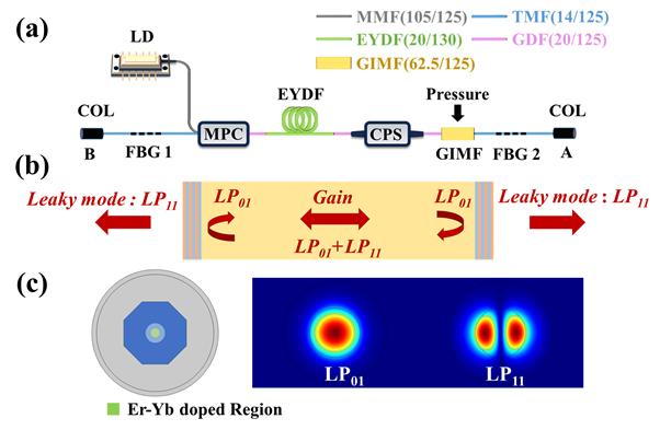 研究团队提出“泄露模式输出光纤激光器”结构,利用少模光纤布拉格光栅(Few-Mode Fiber Bragg Grating, FM-FBG)作为激光腔的腔镜与模式滤波器,使基模(LP₀₁)在腔内振荡,高阶模(LP₁₁)以漏模形式输出。通过在腔内加入渐变折射率多模光纤(Graded-Index Multimode Fiber, GIMF)与少模光纤(Few-Mode Fiber, FMF)组合构成模式转换器,结合机械压力调控光纤弯曲形变,实现了LP₁₁模激发比例的可控调节,最高达28.24%,输出功率达到2.93W。