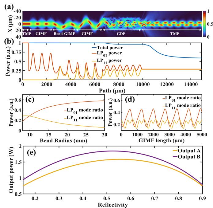 图2 (a)模式转换器内部光场数值模拟;(b)模式转换器内不同模式之间的功率转换;(c)和(d)LP₁₁与LP0₁模式比例的调节;(e)模场转换器与激光器输出的关系。