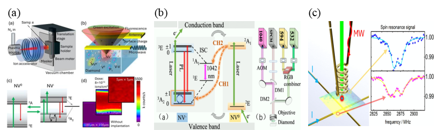 图:(a)利用离子注入技术制备了用于芯片检测的金刚石传感器;(b)揭示了金刚石色心传感器的电荷态特性;(c)实现了基于自旋的超高灵敏度和分辨率的量子磁场探测。
