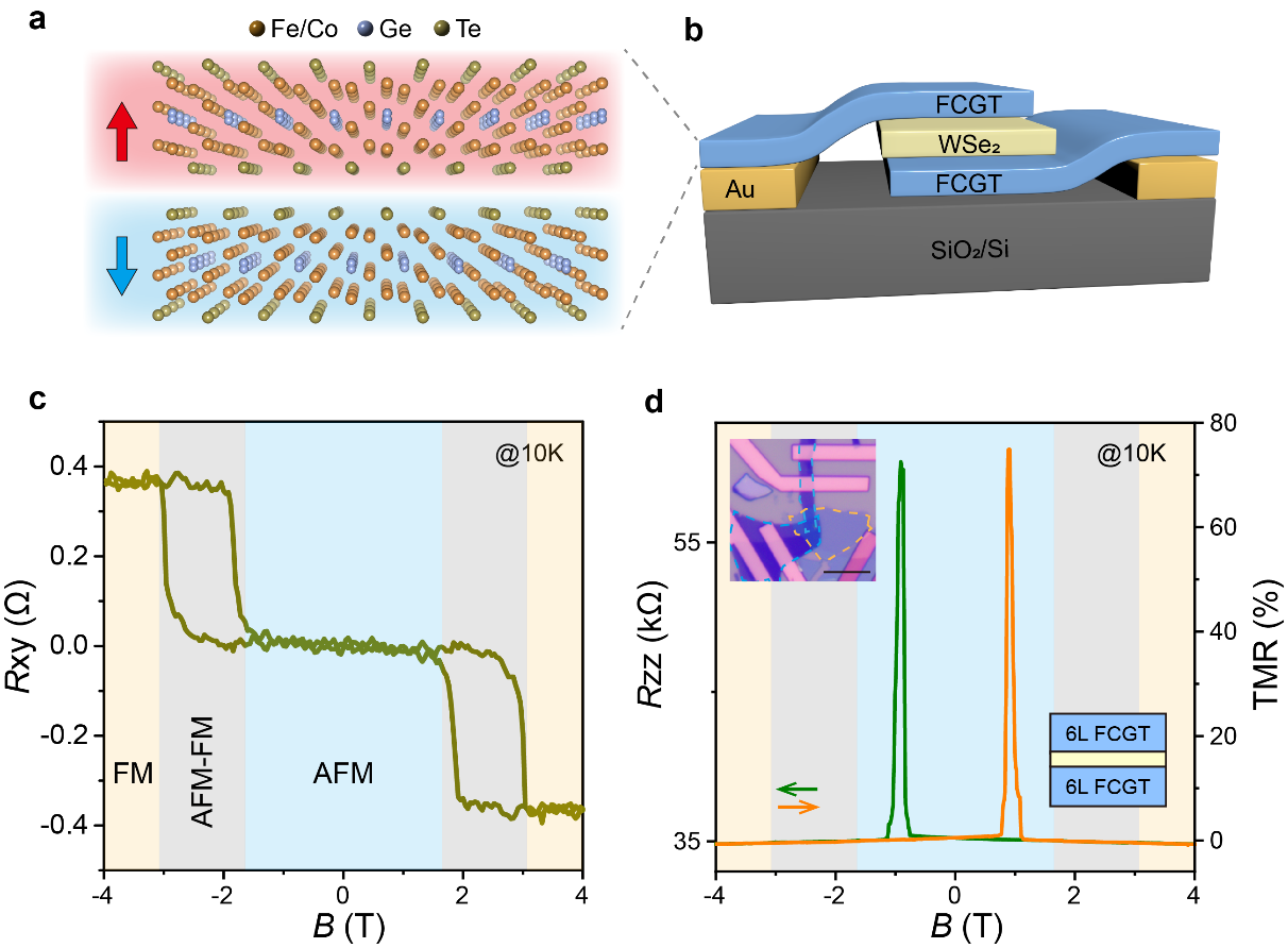 图2. a. A型反铁磁FCGT示意图。b. FCGT/WSe₂/FCGT反铁磁隧道结示意图。c. 6层FCGT在10 K温度下,对称霍尔电阻Rxy随垂直磁场的变化关系。蓝色、灰色、橙色区域分别表示反铁磁态、反铁磁到铁磁转变、铁磁态。d. FCGT/WSe₂/FCGT反铁磁隧道结的隧穿电阻Rzz及对应的TMR比值。磁场扫描方向由绿色和橙色箭头表示。左上角插图为器件的光学显微镜图像,其中蓝色虚线标示FCGT区域,橙色虚线标示WSe₂区域,黑色比例尺为10 µm。右下角插图标示了器件中FCGT的厚度。