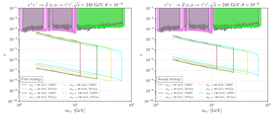 图1. CEPC和FCC-ee对由暗标量粒子瞬时衰变得到的长寿命暗光子的灵敏度。
