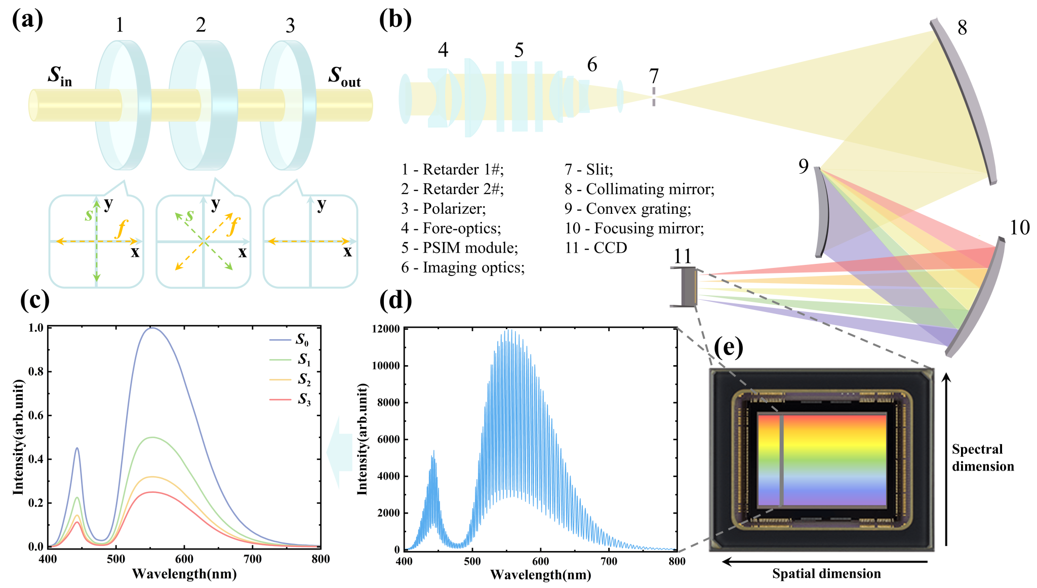 Fig. 1 Principle of channeled spectropolarimeter. (a) Construction of the PSIM module.(b) Optics of the channeled spectropolarimeter based on a Offner grating spectrometer. (c)Stokes parameters spectra of the target obtained by reconstruction method. (d) Modulated spectrum of the target is obtained by extracting the pixel information corresponding to the same spatial dimension. (e) Area array CCD of the channeled spectropolarimeter, the vertical direction represents the spectral dimension and the horizontal direction represents the spatial dimension.