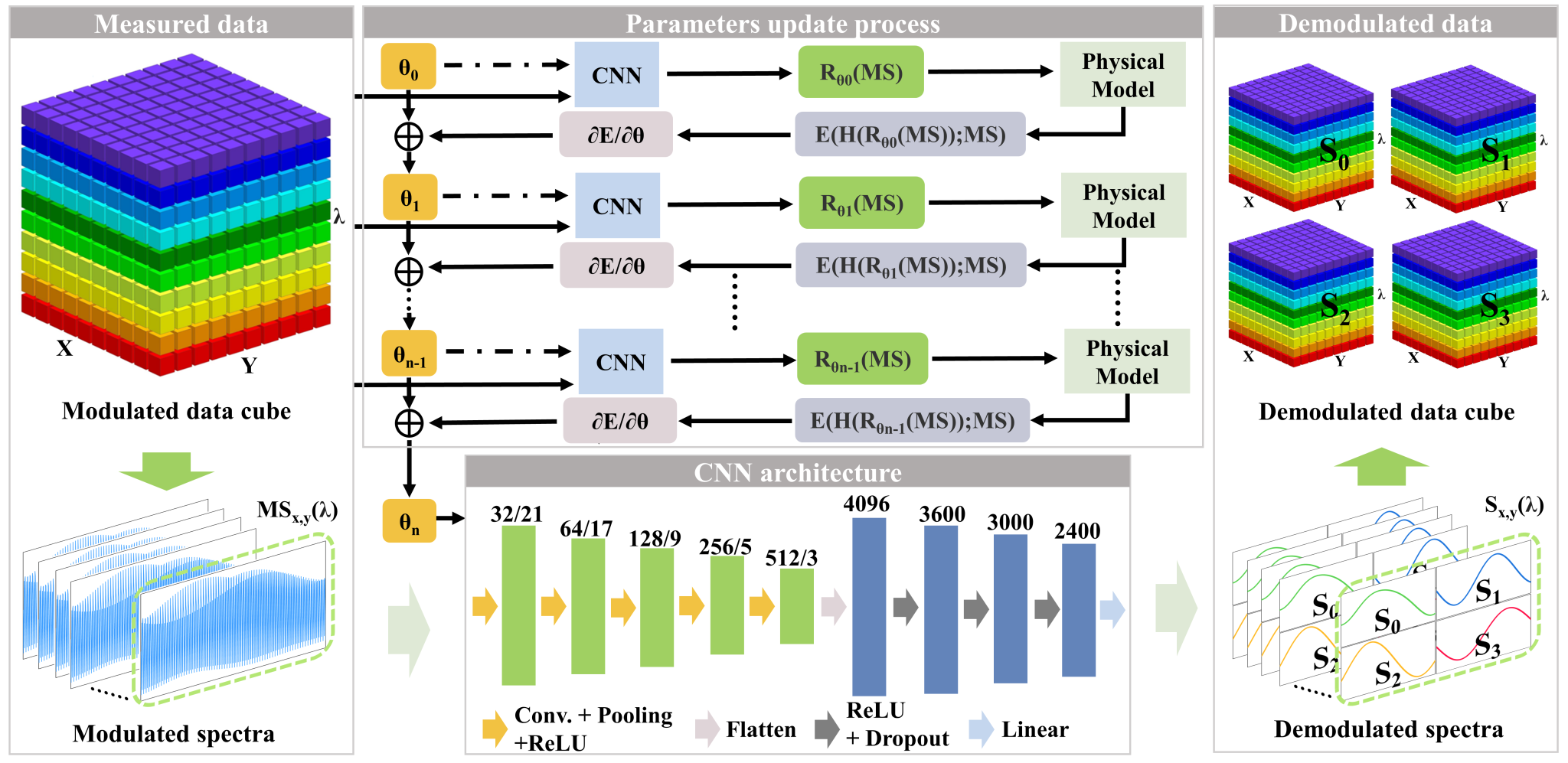 In response to the aforementioned challenges, Professor Jigang Hu's team has devised an innovative solution. They have harnessed the prior information embedded in the CSP's physical model and combined it with the potent modeling capabilities of deep neural networks (DNN). This novel approach has led to the creation of a physics-guided neural network (PGNN), which achieves ultra-high precision and rapid demodulation of modulated data. The workflow is depicted in Figure 2. In contrast to traditional DNN-based methods, PGNN's network parameters initiate with random values and are refined through gradient descent algorithms to obtain precise estimates. This process establishes the mapping relationship between modulated spectra and Stokes parameter spectra. The physical model plays a primary role in constraining the network parameters during the optimization process, thereby providing physical guidance to the DNN's output.
