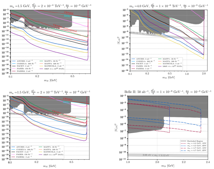 Figure 2. Several sensitivity exclusion plots: the upper and lower-left panels are sensitivity results for the LHC far-detector experiments, while the lower right panel is for Belle II. Upper Left: ALPs produced from D-meson decays, promptly decaying into long-lived HNLs. Upper Right: ALPs produced from B-meson decays, promptly decaying into long-lived HNLs. Lower Left: ALPs produced from D-meson decays, with the long-lived ALPs decaying into long-lived HNLs. Lower Right: ALPs produced from B-meson decays at Belle II, promptly decaying into long-lived HNLs.