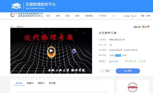 此外,值得一提的是,在视频制作经费严重不足的情况下,通过不断锤炼录课技能,使得自制的课程视频质量达到公开上线的水准。目前慕课已上线安徽智慧教育平台(e会学)(图2)。且课程平台作为《大学物理》课程的近代物理知识的必修模块,供全校理工科本科生线上拓展学习。