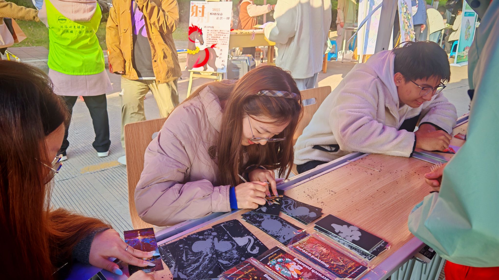 “御·刮出心情”:参与者以刮笔在黑色刮画纸上自由创作,学业压力随五彩图案的浮现悄然释放,每一幅作品都成为独特的情绪印记,实现解压与艺术表达的双重治愈。